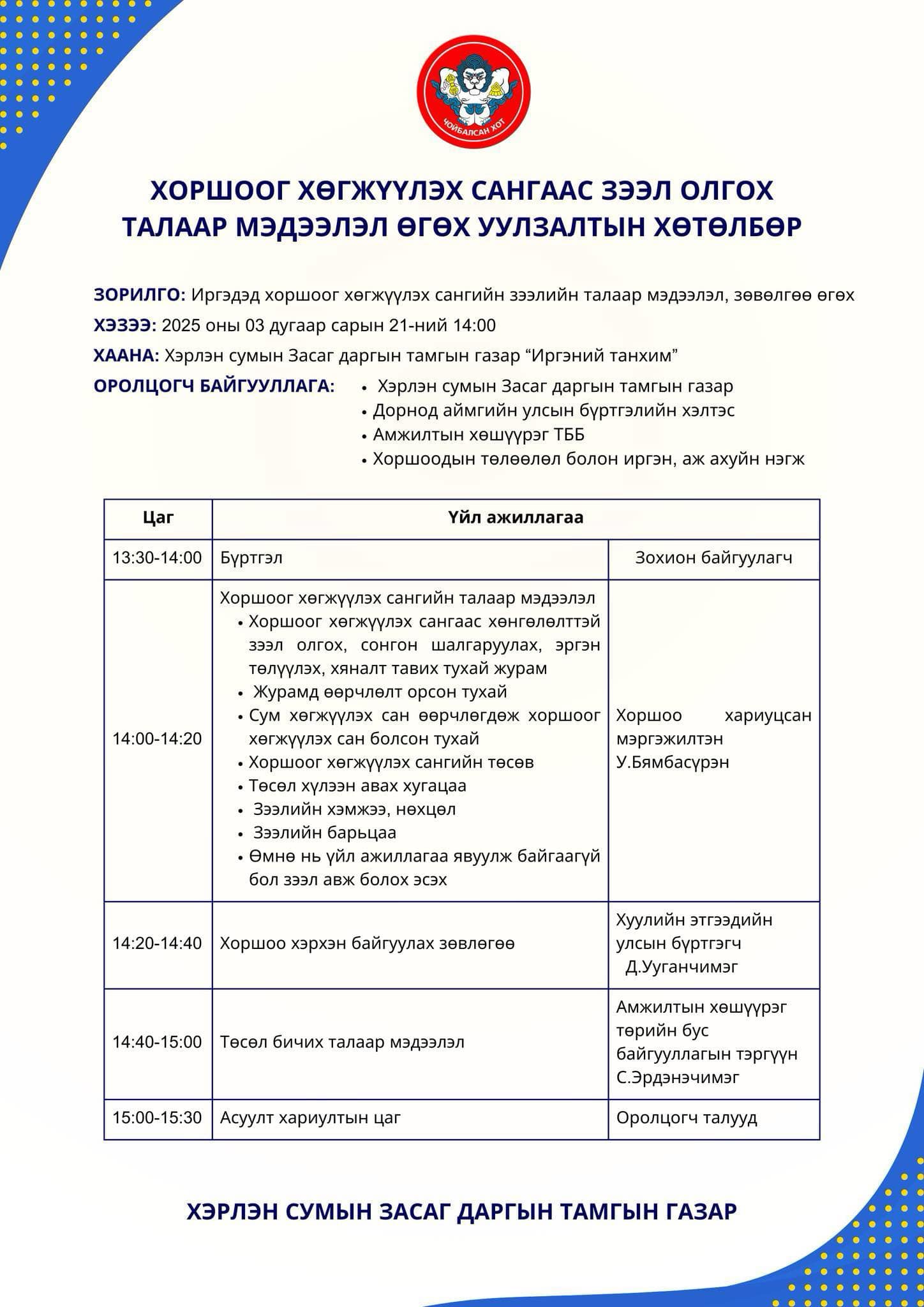Хоршоог хөгжүүлэх сангийн зээлийн талаар мэдээлэл, зөвлөгөө өгөх уулзалт 2025 оны 03 дугаар сарын 21-ний өдрийн 14 цагт Хэрлэн сумын Засаг даргын Тамгын газрын Иргэний танхимд зохион байгуулагдах тул иргэд, хоршоо эрхлэгч та бүхнийг урьж байна.